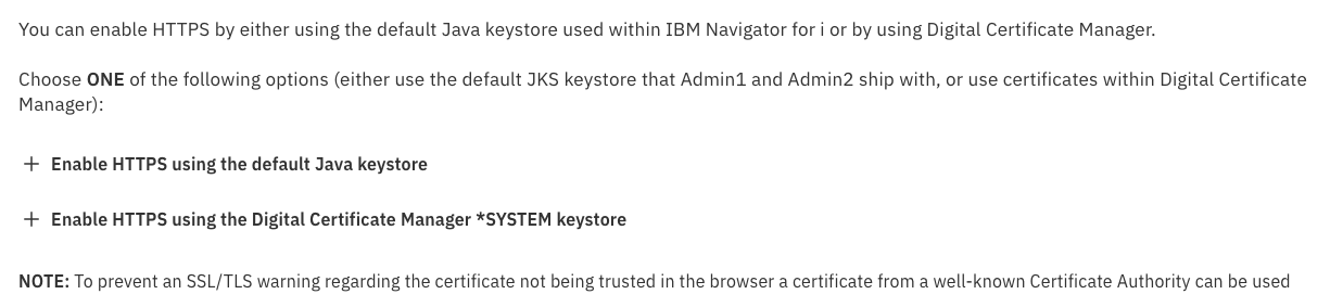If you have not set up SSL/TLS for Telnet, ODBC or any other IBM i application, this might be a good starting point to consider doing that right away. Please have a look at the note which must ring a bell when you are working with an HMC. Due to the fact that when you are using a certificate which is a self-signed certificate you do get a warning. As a self-signed certificate is better than not using SSL/TLS at all, IBM does offer you the choice when enabling HTTPs using a self-signed certificate or using an existing certificate. Many companies use a wildcard certificate for their domain so they can use one certificate for as many servers as they want. In that case the server IBM i is running on will be just one of the Servers the certificate can be used for.