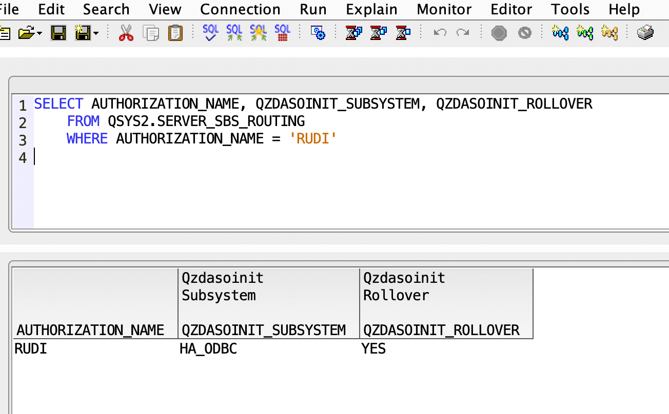 So, when a user initiates an ODBC/JDBC task, the task is started in QUSRWRK but when an entry exists for the user to route their task to another subsystem, this task will start running in that subsystem. With “allow-rollover” set to “NO”, that subsystem needs to active otherwise the connection request will fail.