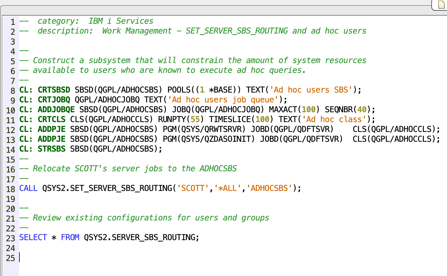 “CALL QSYS2.SET_SERVER_SBS_ROUTING(‘ADMIN’,’*ALL’,’ADHOCSBS’,’NO’)”