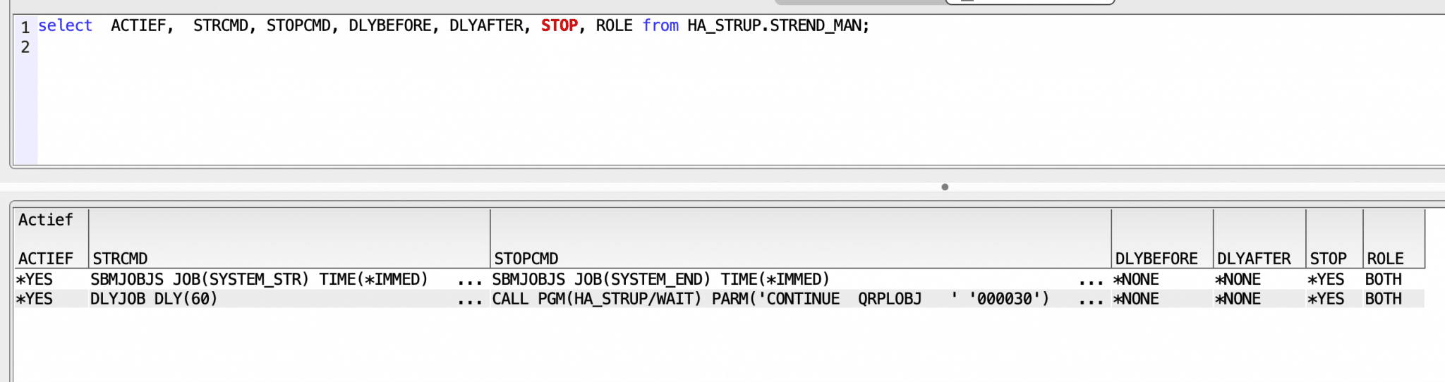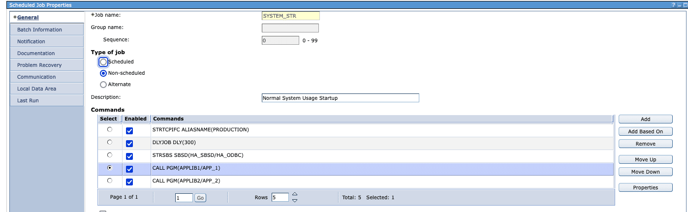 The command STRJOBJS is an Advanced Job Scheduler command which in this case starts the job SYSTEM_STR. This job allows us to make changes to the startup program without a recompile. Below an example of how a SYSTEM_STR Job might look: