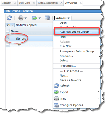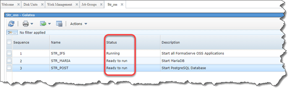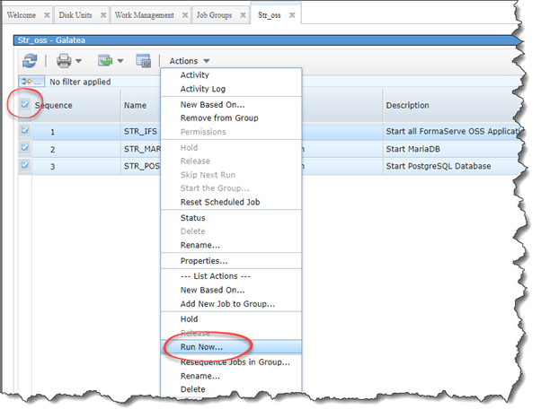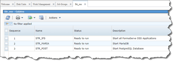 In the figure below, we can see that I have added three jobs to the STR_OSS group. They start our open source applications, start the Maria database server and start the PostgreSQL server.