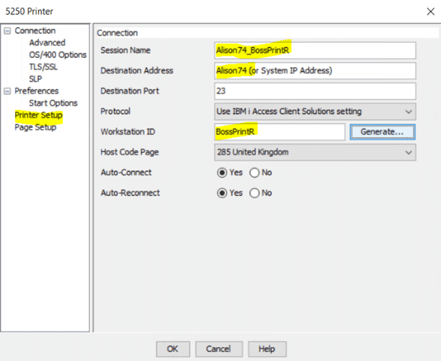 “Workstation ID” is where you specify the actual IBM i DEVD Printer name (max 10 characters, no spaces)
