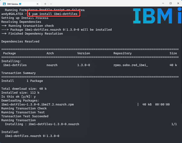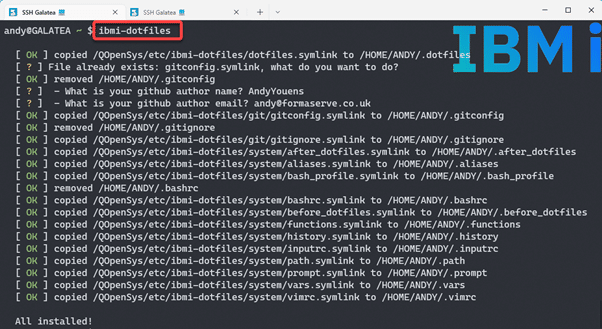 Remember, Dotfiles is configured in a user’s home directory, so we install them by just running the ibmi-dotfiles script and answer any questions it prompts for.