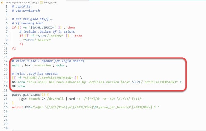 If you do not want your login script to show either the BASH version, nor the Dotfiles informational message shown, just place a comment character (the # in BASH) as the first character on lines 15 and 18 to 20 in the .bash_profile script in your home directory.