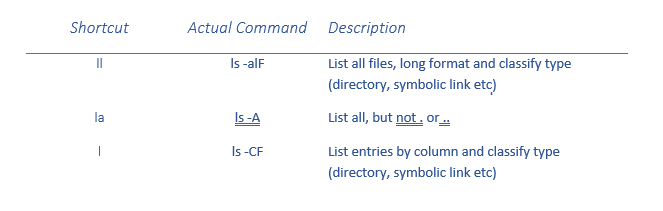 The table below shows the directory listing aliases that are included with Dotfiles.