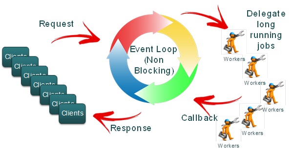 In the diagram below, which is a typical web flow, we can see as soon Node gets a request, it deals with it in the background. Throws it off to batch as we know it.