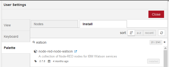 To do this I’ve taken advantage of the node-red-node-watson package that you can download through the “Manage Palette” option: