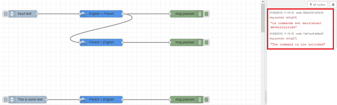 I’ve setup two different flows, one purely for translating their emails to me and another for translating my response back. Just to try and be clever I’m also translating IBMs translation back into English to see if my text still means the same, with mixed results occasionally. In this example my input text is “The order is now unlocked”: