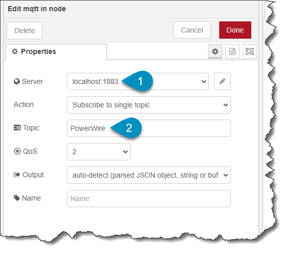 The configuration for the MQTT in node (Step one in the previous figure)