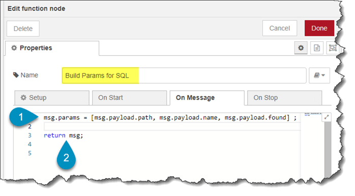 The configuration for the function node, number 3 in the flow diagram.