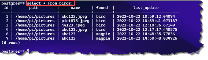 A quick select * from birds shows our results in a postgress shell window.