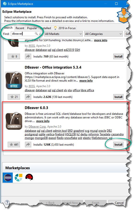 The easiest way to install DBeaver is through the Eclipse marketplace, which can be found under the Help menu.