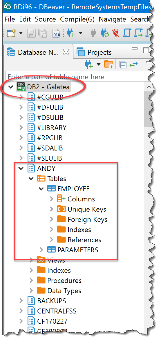 Once the connection is completed, we can expand on the new connection and see all our libraries/schemas, and drill down to see additional details.