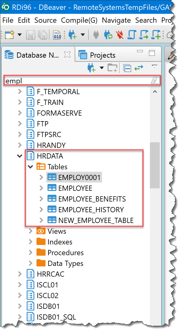 Searching for any database object is easily performed using the search box. This is shown in the figure below.